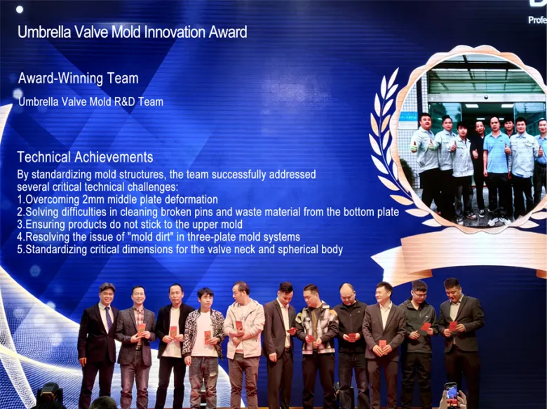 ब्रेकथ्रू अवार्ड" थ्री-लेयर प्लेट मोल्ड संरचना में उनके महत्वपूर्ण तकनीकी नवाचार के लिए। यह सम्मान न केवल टीम की तकनीकी क्षमताओं को मान्यता देता है, बल्कि उद्योग की लंबे समय से चली आ रही चुनौतियों का समाधान करने और उत्पादन दक्षता बढ़ाने में हमारे द्वारा उठाए गए एक ठोस कदम का भी प्रतिनिधित्व करता है।